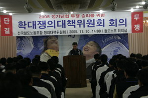 ÀïÀÇÇàÀ§ Âù¹ÝÅõÇ¥ ¾ÐµµÀû °¡°áÀÇ ÈûÀ¸·Î 2¸¸5õ Á¶ÇÕ¿øÀÇ ÇÔ¼ºÀÌ ¼¿ï¿ª¿¡ ¸ð¾ÆÁ³´Ù. 2005³â 11¿ù 20ÀÏ 2Â÷ ÃÑ·Â °áÀÇ´ëȸ´Â 7.000¿©¸íÀÇ Á¶ÇÕ¿øÀÌ ´ëÁ¤ºÎ ÅõÀïÀ» ¼±Æ÷ÇÏ´Â ¿ª»çÀûÀÎ ¼ø°£À» È®ÀÎÇÏ´Â °ÍÀ̾ú´Ù. öµµÀÇ ½ÉÀåºÎÀ̸ç öµµ³ëµ¿ÀÚÀÇ °ÅÁ¡ÀÎ ¼¿ï¿ªÀÇ Çª¸¥ ÇÏ´ÃÀº ¡®Ã¶µµ´Â ±¹¹ÎÀÇ °ÍÀÔ´Ï´Ù¡¯ ¶ó´Â ±ÛÀÚ¿Í ¡®Á¤ºÎÀÇ Ã¥ÀÓȸÇÇ·Î ¼¹ÎÀÇ È£ÁָӴϰ¡ »õ°í ÀÖ½À´Ï´Ù. ¶ó´Â ¹®±¸¸¦ »ðÀÔÇÑ ³ë¶õ»öÀÇ ¿¡µå¹ú·ûÀ» ¹Ù¶óº¸´Â öµµ³ëµ¿ÀÚÀÇ ÀڽۨÀ» ¼·Î È®ÀÎÇØ Áֱ⿡ ÃæºÐÇÑ ±¤°æÀ̾ú´Ù.