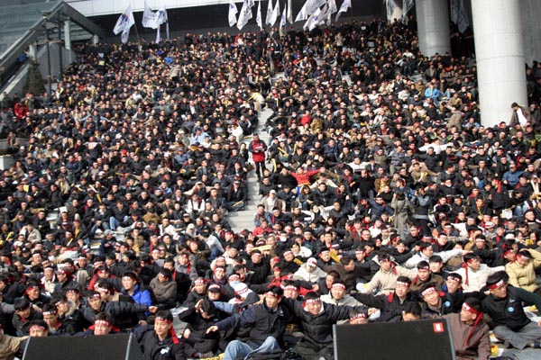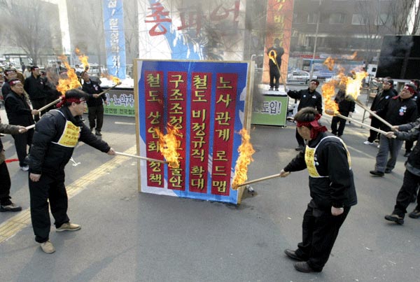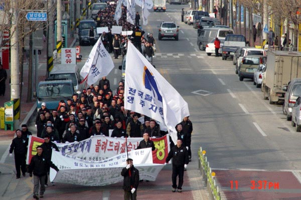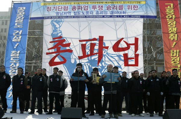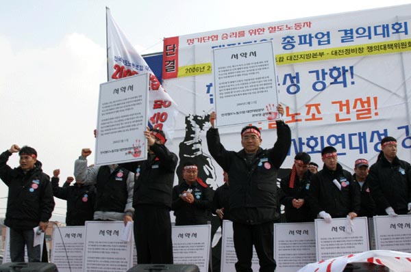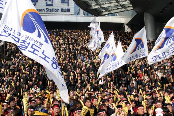 1500¿© ´ëÀüÁö¿ª Á¶ÇÕ¿øµéÀÌ ´ëÀü¿ª µ¿±¤ÀåÀ» °¡µæ ¸Þ¿ü´Ù. ÀÌÁ¦ öµµ³ëµ¿ÀÚµéÀº Á¤ºÎÀÇ ¹«Ã¥ÀÓ°ú °ø»çÀÇ À߸øµÈ ¼öÀÍÃß±¸ÀÇ °æ¿µ¿¡ ¸Â¼ öµµ³ëµ¿ÀÚÀÇ °í¿ë¾ÈÁ¤°ú ±¹¹ÎÀÇ º¸ÆíÀû öµµÀÌ¿ëÀ» À§ÇØ ¶³ÃÄ ÀϾ°í ÀÖ´Ù.