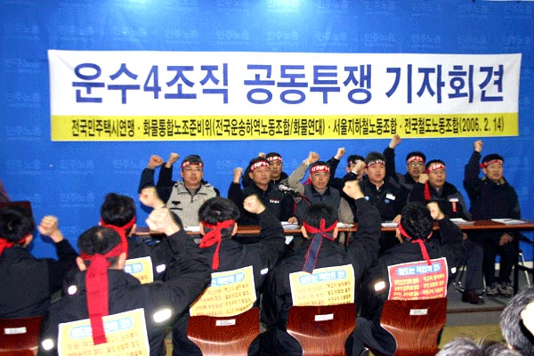 2¿ù 14ÀÏ Ã¶µµ/ ÁöÇÏö/ ȹ°/ Åýà µî 4»ç ¿î¼ö³ëÁ¶°¡ ±âÀÚȸ°ßÀ» ¿°í °øµ¿ÅõÀïÀ» °áÀÇÇß´Ù. ¿ÀÀü 10½Ã ¹ÎÁÖ³ëÃÑ 1Ãþ ±âÀڽǿ¡¼ ¿¸° °øµ¿±âÀÚȸ°ß¿¡¼ ¿î¼ö 4»ç ³ëÁ¶´Â ¡®¿î¼ö»ç¾÷ÀÇ °ø°ø¼ºÀ» Áö۱â À§ÇØ ÅõÀï¿¡ µ¹ÀÔÇÑ´Ù¡¯°í ¼±¾ðÇß´Ù.
