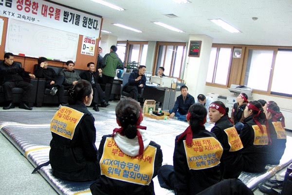 6½Ã°£À» ³Ñ±â´Â Àå½Ã°£ÀÇ ±³¼·À̾úÁö¸¸ ³ë»ç°£ÀÇ ÆØÆØÇÑ ÀǰßÂ÷¸¸À» È®ÀÎÇßÀ» »ÓÀÌ´Ù. ¶Ç <ÇØ°íÀÚ º¹Á÷°ú ºñÁ¤±ÔÁ÷ Â÷º° öÆó> µî ³ª¸ÓÁö Çٽɿ䱸¾È¿¡ ´ëÇØ¼± °ø»çÃøÀÇ ÀÔÀåÀÌ ¸¶·ÃµÇÁö ¾Ê¾Æ ³íÀÇÁ¶Â÷ ÇÏÁö ¸øÇß´Ù. ÇÑÆí ¿À´ÃÀº ³ëµ¿ºÎ¿¡¼ ³ª¿Í öµµ³ë»ç ±³¼·¿¡ °ü½ÉÀ» º¸ÀÌ´Â µî öµµ³ëµ¿ÀÚÀÇ ÅõÀï¿¡ °ü½ÉÀ» º¸¿´´Ù. ¶Ç »çÃøÀÇ ½Â¹«Á¦Áö¿¡ ¸Â¼ ¼¿ï°ú ºÎ»ê¿¡¼ ÅõÀïÁßÀÎ KTX ¿©½Â¹«¿ø 20¿©¸í ±³¼·Àå ¹Û¿¡¼ ÇÇÄÏÀ» µé°í ħ¹¬½ÃÀ§¸¦ ¹úÀ̱⵵ Çß´Ù.