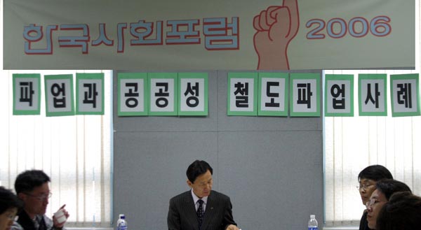 À̳¯ »çȸÀÚÀÎ ±è»ó°ï ±³¼ö´Â ¡°°ø°øºÎºÐÀÇ ¹Î¿µÈ°¡ 20³â ÀüºÎÅÍ ÁøÇàµÇ¾ú´Ù. °¡Àå ±¹¹ÎÀûÀÎ º¸ÆíÀû ¼ºñ½º¸¦ Á¦°øÇϴ öµµ°¡ ¹Î¿µÈÀÇ Àü´Ü°èÀÎ °ø»ç°¡ µÇ¾ú´Ù. öµµ³ëµ¿ÀÚ°¡ öµµ°ø°ø¼ºÀ» °¡Áö°í ÆÄ¾÷À» ÇßÁö¸¸ ÀÌ·± ÆÄ¾÷ÀÌ º¸¼ö¾ð·Ð°ú ½Ã¹Î»çȸ´ÜüÀÇ ºñÆÇ°ú ³Ã´ãÀ¸·Î Á¤ºÎ´Â °°æÇÑ Åº¾ÐÀ¸·Î ³ª¿Í 4ÀÏ ¸¸¿¡ ÆÄ¾÷À» Á¢¾ú´Ù. ´ÜÁö ÆÄ¾÷ÀÚü¸¸ °¡Áö°í À̾߱âÇϱ⺸´Ù °ø±â¾÷ÀÇ °ø°ø¼ºÀÇ »ç·Ê¸¦ ¿ì¸®°¡ ¾î¶»°Ô ÀÌÇØÇÏ°í ³íÀÇÇÏ¿©¾ß ÇÏ´ÂÁö¸¦ °í¹ÎÇÏ´Â Åä·Ðȸ°¡ µÇ¾î¾ß ÇÑ´Ù¡±°í ÇÏ¿´´Ù.