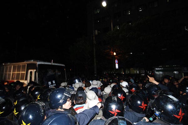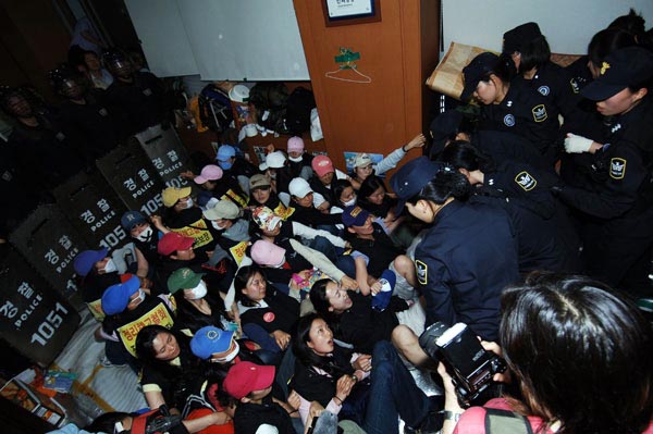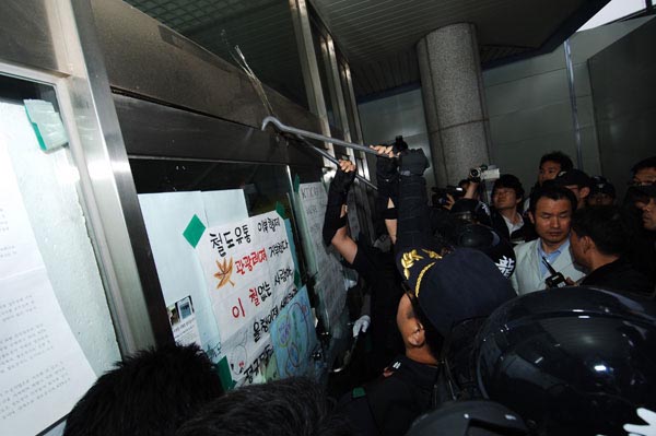 ¿ÀÈÄ 7½Ã °ø±Ç·ÂÀÌ ÅõÀÔµÇÀÚ ¼¿ïº»ºÎ 2Ãþ ȸÀǽǿ¡ ¸ð¿© ÀÖ´ø ¿©½Â¹«¿øµéÀº ¹®À» Àá±×°í ÀúÇ×Çß´Ù. ±×·¯³ª °æÂûÀº ÇØ¸Ó¿Í Àý´Ü±â¸¦ µ¿¿øÇØ ¹®À» ºÎ½¥´Ù. ±º»çÁ¤±Ç¿¡¼³ª º¼ ¼ö ÀÖ´Â ±¤°æÀÌ ÀÌö »çÀåÀÌ À̲ø°í Àִ öµµ°ø»ç¿¡¼ ÀÏ¾î³ °ÍÀÌ´Ù.
