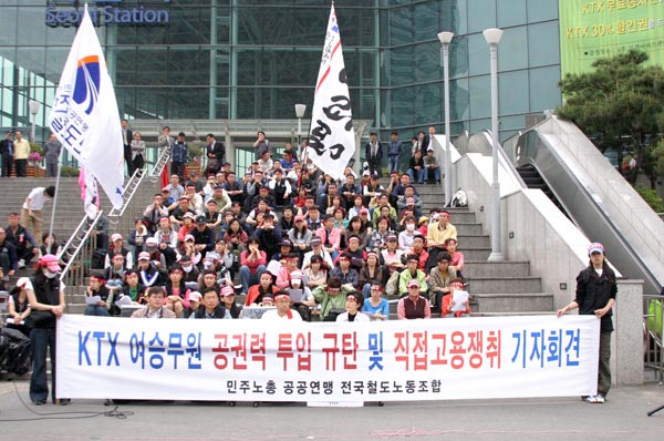 KTX ¿©½Â¹«¿øµé¿¡ ´ëÇÑ °ø±Ç·Â °³ÀÔÀÇ °µµ°¡ ³ô¾ÆÁü¿¡ µû¶ó »ó±Þ´ÜüÀÇ ¿¬´ëÅõÀïµµ º»°Ýȵǰí ÀÖ´Ù. Àü±¹°ø°ø¿î¼ö»çȸ¹ö½º³ëµ¿Á¶ÇÕ(°ø°ø¿¬¸Í)Àº 14ÀÏ Çö´ëÇÏÀ̽ºÄÚ ³ëµ¿ÀÚµéÀÌ ¿Èê° Ÿ¿öÅ©·¹ÀÎ °í°ø³ó¼ºÀ» ¹úÀÌ´Â ¾çÀ絿 Çö´ë »ç¿Á ¾Õ¿¡¼ ¿±â·Î Çß´ø °áÀÇ´ëȸ Àå¼Ò¸¦ ¼¿ï¿ª ¾ÕÀ¸·Î º¯°æ, KTX ¿©½Â¹«¿îµé°ú ¿¬´ëÇÑ ´ë±Ô¸ð Áýȸ¸¦ °¡Áú ¿¹Á¤ÀÌ´Ù.