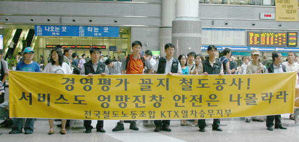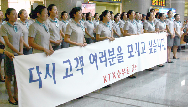 KTX ¿©½Â¹«¿øµéÀº À̳¯ ¾È³» ¹× ¿µÁ¢Àλ縦 Çϱ⿡ ¾Õ¼ "öµµ°ø»çÀÇ Á¤¸®Çذí·Î ¾ÆÁ÷±îÁö °í°´ÀÇ °çÀ¸·Î µ¹¾Æ°¡Áö ¸øÇϰí ÀÖ´Ù"¸ç ¡°±×·¯³ª ÀúÈñ´Â ¹Ýµå½Ã ½Â¸®ÇÏ¿© °í°´ÀÇ °çÀ¸·Î µ¹¾Æ°¡°Ú´Ù¡±°í È£¼ÒÇÏ¿´´Ù.