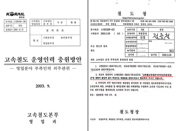 9¿ù Áß¼ø°æ KTX ¿©½Â¹«¿øµéÀÇ ºÒ¹ýÆÄ°ß Á¶»ç °á°ú¸¦ ¹ßÇ¥¸¦ ¾ÕµÎ°í 2003³â ´ç½Ã öµµÃ»°ú ³ëµ¿ºÎ°¡ KTX ½Â¹«¿øÀ» µµ±ÞÀ§Å¹Çϸé À§¹ýÀ̶ó´Â »ç½ÇÀ» ¾Ë¸é¼µµ À̸¦ °ÇàÇÑ ¹®¼°¡ Æø·ÎµÇ¾î ÆÄ¹®ÀÌ Àϰí ÀÖ´Ù.