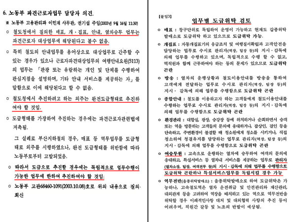 ÀÌ´Â ³ëµ¿ºÎ¿Í öµµ°ø»ç°¡ ÀÌ¹Ì 2003³â¿¡ KTX ¿©½Â¹«¿ø ¾÷¹«ÀÇ À§Å¹ÀÌ ÇöÇà ÆÄ°ß¹ý¿¡ ÀúÃ赃 ¼ö ÀÖ´Ù´Â °ÍÀ» ¾Ë°í ÀÖ¾úÀ½À» º¸¿©ÁØ´Ù.