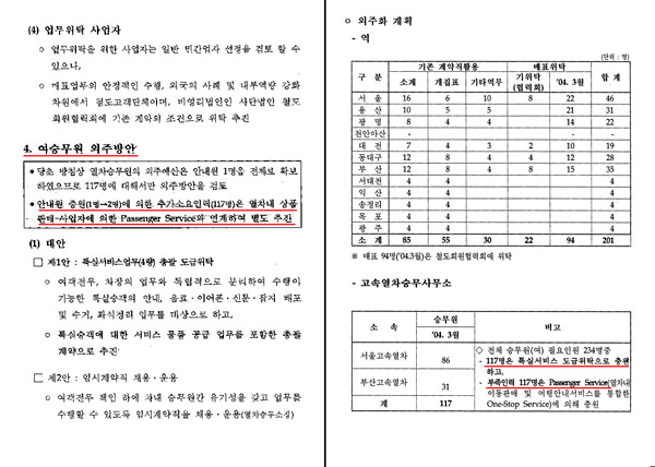 ´ç½Ã ±è¼¼È£ Àü öµµÃ»Àå µîÀÇ °áÀ縦 ¸¶Ä£ ÀÌ ¹®¼¿¡ µû¸£¸é öµµÃ»Àº KTX°¡ °³ÅëµÇ±â ÀÌÀüÀÎ 2003³â 9¿ù ´ç½Ã ³ëµ¿ºÎ¿¡ KTX ½Â¹«¿øµéÀ» µµ±ÞÀ§Å¹ ÇÏ´Â °ÍÀÌ °¡´ÉÇÑÁö¸¦ ÁúÀÇÇÏ¿´°í, ÀÌ¿¡ ´ëÇØ ³ëµ¿ºÎ °ü°èÀÚ´Â "öµµÃ»¿¡¼ ÁúÀÇÇÑ ¸ÅÇ¥, °³¡¤ÁýÇ¥, ¾È³», ¿Â÷½Â¹« ¾÷¹«´Â ÆÄ°ß±Ù·ÎÀÚ ´ë»ó ¾÷¹«¿¡ ÇØ´çµÈ´Ù°í º¼ ¼ö ¾ø°í, µµ±ÞÀ¸·Î ÃßÁøÇÒ °æ¿ì µ¶¸³ÀûÀ¸·Î ¾÷¹«¼öÇàÀÌ °¡´ÉÇÑ ¾÷¹«¿¡ ÇÑÇÏ¿© ÃßÁøÇØ¾ß Çϸç, Ư½Ç¼ºñ½º¾÷¹«¸¦ µ¶¸³½Ãų °æ¿ì¸¸ °¡´ÉÇÏ´Ù"´Â ´äº¯À» ¹Þ¾Ò°í öµµÃ» ¶ÇÇÑ À̸¦ ¹Þ¾Æµé¿© ´ç½Ã¿¡´Â öµµÃ»Àº ÇÊ¿äÀοø 234¸íÁß 117¸íÀº Ư½Ç¼ºñ½º µµ±ÞÀ§Å¹À¸·Î Ãæ¿øÇϰí, 117¸íÀº Passenger Service(¿Â÷ ³» À̵¿ÆÇ¸Å ¹× ¿©Çà¾È³» ¼ºñ½º¸¦ ÅëÇÕÇÑ ¿ø½ºÅé ¼ºñ½º)¿¡ ÀÇÇØ Ãæ¿øÅä·Ï °èȹÀ» ¼¼¿ü´ø °ÍÀ¸·Î È®ÀεƴÙ.