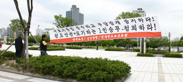 À̱â´ã Á¦Ãµ±â°üÂ÷ ÁöºÎÀåÀº ¡°°ø»ç°¡ ¿¬Àå±Ù·Î °ÅºÎ¸¦ ÀÌÀ¯·Î Áß¡°è Çϰڴٸç ÇÑ»ç¶÷À» ¡°èÇÏ¿©µµ 2¸¸ 5õ Á¶ÇÕ¿ø Áß Ã¶µµ°ø»çÀÇ ºÎ´çÇÑ Ã³»ç¿¡ ¼øÁ¾ÇÒ Á¶ÇÕ¿øÀº ÇÑ¸íµµ ¾øÀ»°ÍÀ̰í, ±×µéÀÌ À̸¦ ±ú´ÝÁö ¸øÇÏ¸é ±ú´ÞÀ» ¶§ ±îÁö ÅõÀïÇÏ´Â °ÍÀÌ ¿ì¸®ÀÇ Àǹ«¡± ¶ó¸ç ¡°½Â¸®Çϴ öµµ³ëµ¿ÀÚÀÇ ¸ð½ÀÀ» º¸¿©ÁÙ °Í¡±À̶ó°í ÅõÀïÀÇ ÀÇÁö¸¦ ¹àÇû´Ù.