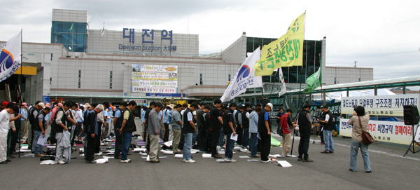ÀÌ´ë½Ä ½ÅÀÓ ´ëÀüÁö¹æº»ºÎ º»ºÎÀåÀº ¡°Á¤ºÎ°¡ ºñÁ¤±ÔÁ÷À» °í¹ÎÇÑ´Ù°í ÇÏ¸é¼ Çã¿ï ÁÁ°Ô öµµ°ø»ç´Â ºñÁ¤±ÔÁ÷ÀÇ Àü¸é¿ÜÁÖÈ·Î °¡°í Çϰí ÀÖ´Ù¡± ¸ç ¡°Á¤ºÎ¿Í ÇÑÆÇÀÇ ½Î¿òÀÌ ¾ø´Ù¸é ¿ì¸®ÀÇ »ýÁ¸±ÇÀ» ÁöŰ´Â °ÍÀº ¾î·Á¿ï °Í¡± À̶ó¸ç ºñÁ¤±ÔÁ÷ ³ëµ¿ÀÚ ½º½º·Î ¶³ÃÄ ÀϾ ÇÔ²² ÇØ°áÇØ ³ª°¡ÀÚ ÇÏ¿´´Ù.