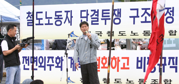 ºñÁ¤±ÔÁ÷ µ¿ÁöµéÀº ±¸È£¸¦ ¿ÜÄ¡°í ³ë·¡¸¦ ºÎ¸£¸ç 3.1 ÆÄ¾÷¶§ÀÇ ¸ð½ÀÀÌ »ý°¢³ª °¨È¸°¡ »õ·Ó´Ù°í Çß´Ù. ¹ÚÁØ µ¿Áö¿Í ³ë·¡°øÀåÀÇ °ø¿¬¼Ó¿¡ ¸ÕÀú ÅõÀïÀ» ½ÃÀÛÇÑ KTX ¿©½Â¹«¿øµéÀÌ ¾Õ¿¡¼ ³ë·¡À²µ¿À» º¸¿©ÁÖ¾ú´Ù. ¸ðó·³ Áýȸ¿¡ Âü¼®ÇÑ ºñÁ¤±ÔÁ÷ µ¿ÁöµéÀº °ð Áýȸ¿¡ Àͼ÷ÇØÁ³´Ù. ºñÁ¤±ÔÁ÷ Á¶ÇÕ¿øµéÀº "KTX µ¿ÁöµéÀÌ 200ÀÏ ÆÄ¾÷À» ÇÏ¸é¼ ±¼ÇÏÁö ¾Ê°í ÅõÀïÇϰí ÀÖ´Â °ÍÀº öµµ°ø»çÀÇ ¿ÜÁÖÈ Á¤Ã¥¶§¹®" À̶ó¸ç öµµ°ø»çÀÇ ºñÁ¤±Ô °è¾àÁ÷ ¿ÜÁÖÈ À½¸ð¸¦ ºÐ¼âÇÏ¿© °í¿ë¾ÈÁ¤À» ÀïÃëÇϰí Â÷º°Ã¶Æó¸¦ ºÐ¼â ÇÒ °ÍÀ» °áÀÇÇÏ¿´´Ù.