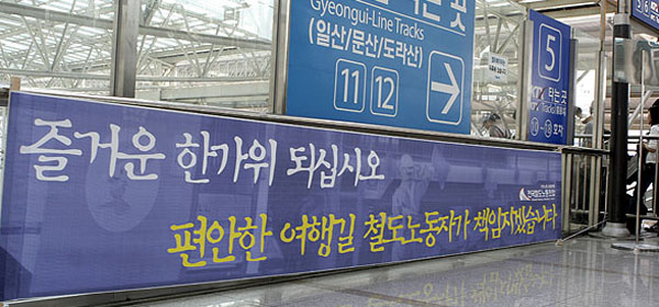 À̳¯ ¼±ÀüÀü°ú ÇÔ²² Àü±¹ÀÇ °ÅÁ¡¿ª°ú Á¾Âø¿ª¿¡´Â ¡®Áñ°Å¿î ÇѰ¡À§ µÇ½Ê½Ã¿À Æí¾ÈÇÑ ¿©Çà±æ öµµ³ëµ¿ÀÚ°¡ Ã¥ÀÓÁö°Ú½À´Ï´Ù¡¯ ¶ó´Â Çö¼ö¸·À» °É°í ½Ã¹Îµé¿¡°Ô Ãß¼®Àλ縦 ÇÏ¿´´Ù. ¿ªÀ» Áö³ª´Â ½Ã¹ÎµéÀº ¹«½ÉÈ÷ Áö³ªÄ¡´Ù Çö¼ö¸·¿¡ ½Ã¼±ÀÌ ¸ØÃ߱⵵ ÇÏ¿´´Ù.