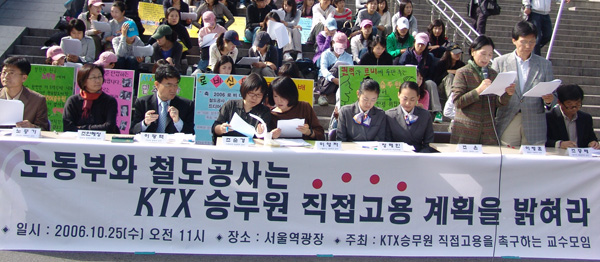 ³ëµ¿ºÎ°¡ KTX ½Â¹«¿øÀÇ ºÒ¹ýÆÄ°ßÀ» ÀÎÁ¤ÇÏ¸é °ø±â¾÷ ¹× ¹Î°£ ±â¾÷¿¡ ¹ÌÄ¡´Â ÆÄÀåÀÌ ³Ê¹« Ä¿ ¿ì¸® °æÁ¦°¡ °¨´çÇÏ±â ¾î·Æ´Ù¡±, ¡°Ã¶µµ°ø»ç´Â À§Å¹¾÷üÀÎ KTX°ü±¤·¹Àú Á¤±ÔÁ÷À» ½Â¹«¿øµé¿¡°Ô Á¦¾ÈÇßÀ¸¸ç, ´õ ÀÌ»ó öµµ°ø»ç°¡ ÇÒ ¼ö ÀÖ´Â °ÍÀÌ ¾ø´Ù¡± ¡°Ã¶µµ°ø»ç¿¡ ¼ºÂ÷º°Àº ¾øÀ¸¸ç ±¹°¡ÀαÇÀ§¿øÈ¸ÀÇ ¼ºÂ÷º° ½ÃÁ¤ ±Ç°í ÀÌÀü¿¡ ÀÌ¹Ì ¼ºÂ÷º° °³¼±µÇ¾ú´Ù. ´Â ³ëµ¿ºÎ¿Í öµµ°ø»çÀÇ °ÅÁþ¸»¿¡ ´ëÇÑ Áö½ÄÀÎÀÇ ¾ç½ÉÀ¸·Î 2006³â 10¿ù 25ÀÏ ¿ÀÀü 11½Ã ¼¿ï¿ª ±¤Àå¿¡¼ KTX ¿©½Â¹«¿ø Á÷Á¢°í¿ëÀ» Ã˱¸ÇÏ´Â ±³¼ö±âÀÚȸ°ßÀ» °³ÃÖÇÏ¿´´Ù.