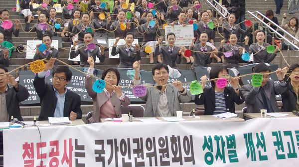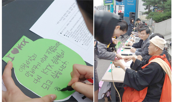 À̳¯ ±âÀÚȸ°ßÀå¿¡¼ KTX ¿©½Â¹«¿øµéÀº ±ÝÁÙ ¸ð¾çÀÇ ¼¼³¢ ÁÙ¿¡ ÀڽŵéÀÇ Èñ¸ÁÀ» ´ãÀº ´Ù¾çÇÑ »ö±òÀÇ Á¾À̸¦ ºÙÀ̰í öµµ°ø»ç¿¡ ¼ºÀÌ ÆòµîÇÑ Åº»ýÀ» ¿°¿øÇÏ¿´´Ù. ´Ù¾çÇÑ ¿©¼º´Üü°¡ Âü¿©ÇÏ°í ½Ã¹Î, Á¾±³, Çаè, ¹ýÁ¶°è µî ¸¹Àº ´ÜüÀÇ ÁöÁö¿Í ¾öÈ£¸¦ ¹Þ´Â °ÍÀº ³Ê¹«³ª ¿ä±¸°¡ Á¤´çÇÔÀ¸·Î ´õ¿í ¸¹Àº ½Ã¹ÎµéÀÇ ÁöÁö ¼Ó¿¡ ÅõÀïÀ» ÇØ ³ª°¥ °ÍÀÌ´Ù.