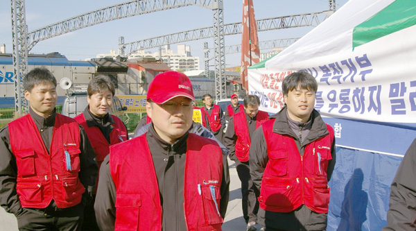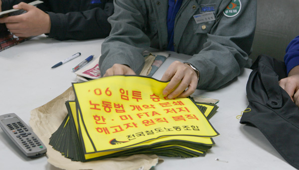 Á¶ÇÕÀº »çº¹ÅõÀï°ú º½ º®º¸ ºÎÂøÀ» ½ÃÀÛÀ¸·Î öµµ³ëµ¿ÀÚÀÇ ¿ä±¸¸¦ Àü¸é¿¡ ³»°É°í ÅõÀïÀ» ÁغñÇϰí ÀÖ´Ù. Á¶ÇÕ¿øµéÀº ÇÑ¹Ì FTA ÀúÁö, ÇØ°íÀÚº¹Á÷, ÀÓÅõ½Â¸® µîÀ» ¿ä±¸ÇÏ´Â ¸ö º®º¸¸¦ ºÎÂøÇϱ⠽ÃÀÛÇÑ °ÍÀÌ´Ù. û·®¸®Áö±¸ ÇÑ Á¶ÇÕ¿øÀº ¡°Áö³ 3.1 ÆÄ¾÷À¸·Î Á¶ÇÕ¿øµéÀÌ ÇǷεµ°¡ ¾ÆÁ÷µµ Ç®¸®Áö ¾Ê¾ÒÀ½¿¡µµ ÅõÀïÀ» ¼±ÅÃÇÑ °ÍÀº Çö¾È¹®Á¦¿¡ ´ëÇÑ Á¶ÇÕ¿øµéÀÇ ¿ä±¸°¡ Àý¹ÚÇÏ´Ù´Â °ÍÀ» Ç¥ÇöÇϰí ÀÖ´Ù¡± °í ÇÑ´Ù.