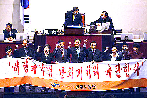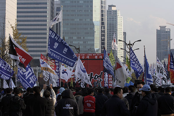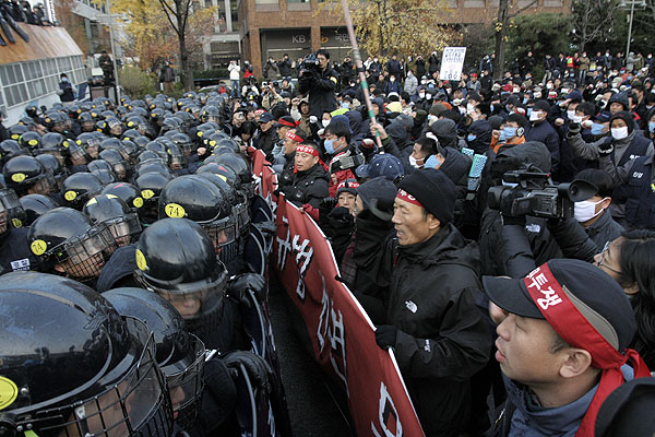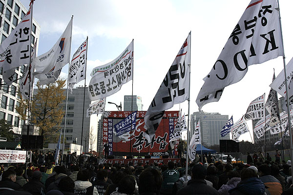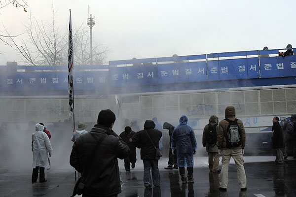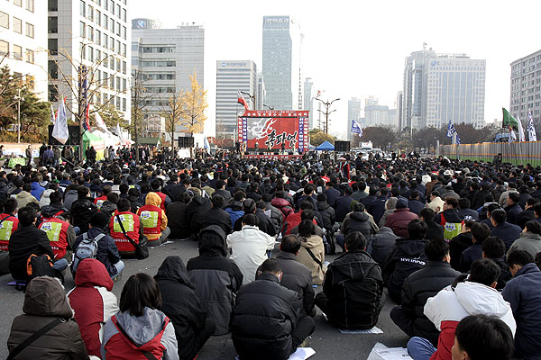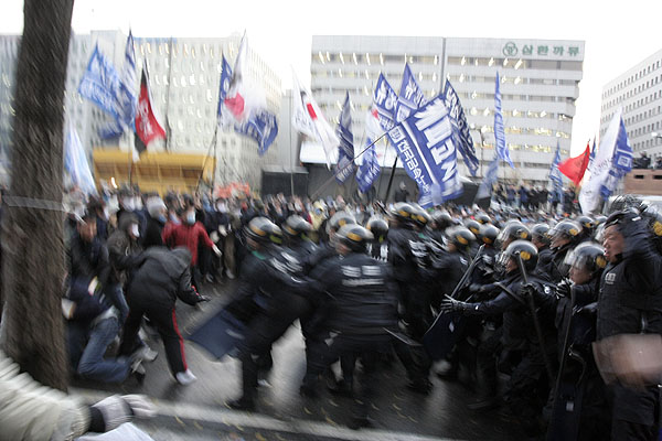 Áýȸ¸¦ ¸¶Ä£ ¹ÎÁÖ³ëÃÑ Á¶ÇÕ¿øµéÀº ºñÁ¤±Ô¹ýÀ» ³¯Ä¡±âÇÑ ±¹È¸·Î Áø°ÝÅõÀïÀ» ¹ú¿´´Ù. ÀÌ °úÁ¤¿¡¼ °æÂûÀº ±¹È¸ ¾Õ Â÷·Î¿¡ Â÷·®À» °ã°ãÀÌ ½×¾Æ ³ëµ¿ÀÚµéÀ» °¡·Î ¸·¾Ò°í, ¿µÇÏÀÇ ³¯¾¾Àε¥µµ ºÒ±¸ÇÏ°í ¹°´ëÆ÷¸¦ ½î´Â°¡ Çϸé, ³ëµ¿ÀÚ¸¦ ¶§·ÁÁ×ÀÎ ¹æÆÐ¿Í °ïºÀÀ» Èֵθ£¸ç üÆ÷Á¶ ±îÁö µ¿¿øÇØ Áýȸ´ë¿À¸¦ ħŻÇÏ¿´´Ù. ÀÌ¿¡ ºÐ³ëÇÑ ³ëµ¿ÀÚµéÀº Åõ¼®ÀüÀ» ½ÃÀÛ ÇÏ¿´°í, ÁÖº¯ °ø»çÀå¿¡¼ °¡Á®¿Â °¢¸ñ µîÀ¸·Î °Ý·ÄÈ÷ ÀúÇ×ÇÏ¿´´Ù. ³ëµ¿ÀÚµéÀÇ ºÐ³ë´Â ÇØ°¡ Àú¹® 6½Ã±îÁö À̾îÁ³´Ù.