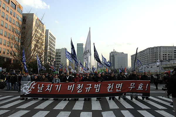 Àü±¹ÀÇ ³ëµ¿ÀÚµéÀ» ºÐ³ë·Î µé²ú°Ô Çϰí ÀÖ´Â »ç¿ë»çÀ¯Á¦ÇÑ ¾ø´Â ºñÁ¤±Ô È®»ê¹ýÀº ºñÁ¤±ÔÁ÷ ³ëµ¿ÀÚ¸¦ ¿µ¿øÈ÷ ºñÁ¤±ÔÁ÷À¸·Î ³²°Ô ÇÒ »Ó ¾Æ´Ï¶ó ºñÁ¤±ÔÁ÷À» ¹«ÇÑÁ¤ È®´ëÇÒ »ÓÀÌ´Ù. ¿©±â¿¡ Á¤ºÎ´Â ¿¹Á¤µÈ´ë·Î Á¤¸®ÇØ°í ¹× ºÎ´çÇØ°í¸¦ ¿ëÀÎÇÏ´Â ¶Ç ÇϳªÀÇ ³ëµ¿¹ý°³¾ÇÀ¸·Î Á¤±ÔÁ÷ÀÇ ¹«Á¦ÇÑ ±¸Á¶Á¶Á¤ÀÇ ±æÀ» ¸¸µé¾î Á¤±ÔÁ÷ÀÇ ºñÁ¤±ÔÁ÷ȸ¦ ¼µÎ¸£°í ÀÖ´Ù.