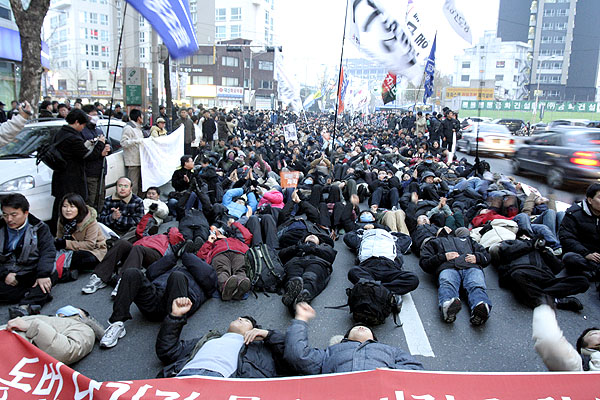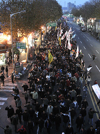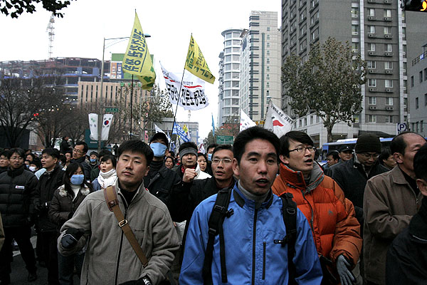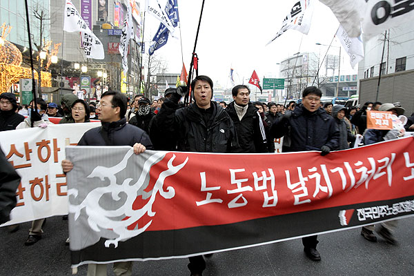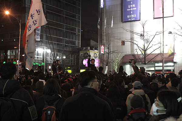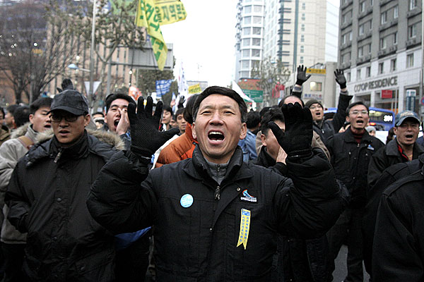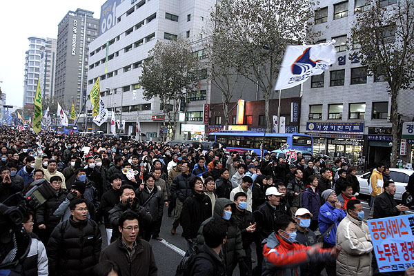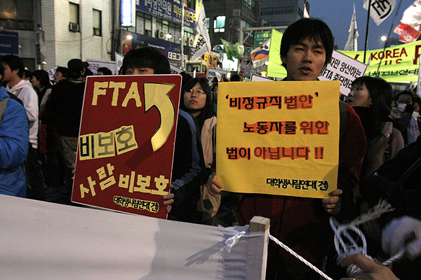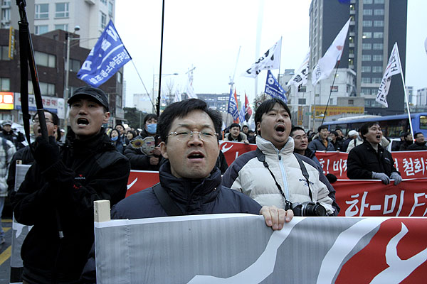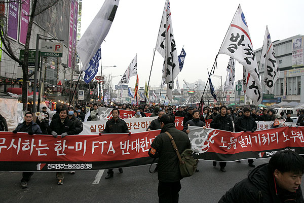 µ¿´ë¹®À¸·Î ¸ðÀÎ ´ë¿À´Â 17½Ã ½ÅÈ£¿¡ µû¶ó 1õ¿© ¸íÀÌ µ¿´ë¹® ¡®µÎ»êŸ¿ö¡¯ ¾Õ µµ·Î¸¦ Á¡°ÅÇÏ°í °¡µÎÇàÁøÀ» ½ÃÀÛÇÏ¿´´Ù. ÇàÁø´ë¿À´Â µ¿´ë¹®¿îµ¿Àå »ç°Å¸®¿¡ À̸£·¯´Â °÷°÷¿¡ ¸ð¿© ÀÖ´ø ³ëµ¿ÀÚ¿Í ½Ã¹ÎµéÀÌ ½ñ¾ÆÁ® ³ª¿Í 4õ ´ë¿À¸¦ Çü¼ºÇÏ°í ¡®ÇѹÌFTA ÀúÁöÇÏÀÚ¡¯, ¡®ºñÁ¤±ÔÁ÷ öÆóÇÏÀÚ¡¯, ¡®³ë¹«ÇöÁ¤±Ç ÅðÁøÇÏ¶ó¡¯ µî ±¸È£¸¦ ¿ÜÄ¡¸ç À»Áö·Î¸¦ ÅëÇØ ÇàÁøÇÏ¿´´Ù.