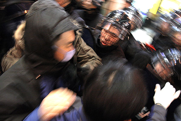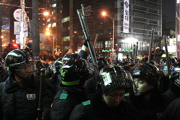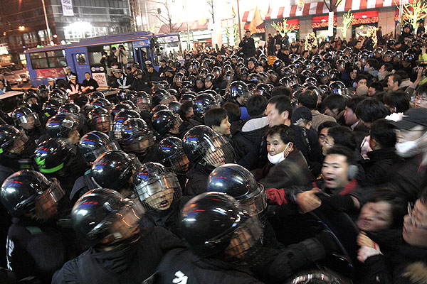 °æÂûÀÇ ºÀ¼â¸¦ ´çÇÏÀÚ ¿ìȸ¸¦ ÅÃÇÑ ¹ü´ëÀ§´Â Åð°è·Î ¡®¹Ð·¹¿À·¹¡¯ ¾ÕÀ¸·Î À̵¿ÇÏ¿© °æÂû°ú ¹Ð°í ´ç±â´Â ¸ö½Î¿òÀ» ÁøÇàÇÏ¿´´Ù. ¸ö½Î¿òÀÌ ÁøÇàµÇ´Â Áß¿¡µµ ȸÇö¿ª¿¡¼ Áýȸ¸¦ ÁøÇàÇÑ Çлý°ú ¸íµ¿ÀÇ ½Ã¹ÎµéÀÌ °¡¼¼ÇÏ¿© ´ë¿À´Â 1¸¸¿© ¸í¿¡ À̸£·¶´Ù.