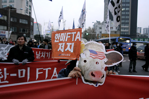 ¸íµ¿ ¡®¹Ð·¹¿À·¹¡¯ ¾Õ¿¡¼ 40¿©ºÐ ¸ö½Î¿òÀ» ¹úÀÎ ´ë¿À´Â 7½Ã 30ºÐ°æ ¸íµ¿À» Áö³ª ¸íµ¿¼º´çÀ¸·Î À̵¿ÇÏ¿© ¡®ÇÑ¹Ì FTA ÀúÁö¸¦ À§ÇÑ Ãкҹ®ÈÁ¦¡¯¸¦ ÁøÇàÇϰí ÀÖ´Ù.