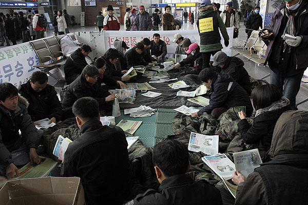 ÁýȸÀÇ ¸¶Áö¸· ¼ø¼·Î ´Ü½Ä³ó¼º¿¡ µ¹ÀÔÇÏ´Â 7¸íÀÇ Á¶ÇÕ¿øµéÀÌ ´Ü½Ä¿¡ µ¹ÀÔÇÏ´Â ºñÀåÀÇ °áÀǹ®À» ³¶µ¶ÇÏ¿´´Ù. ´Ü½Ä³ó¼ºÀÚµéÀº ¡°Èû¾ø´Â °è¾àÁ÷ ³ëµ¿ÀÚ¶ó°í ÀÌ·± ½ÄÀ¸·Î Áþ¹âÀ» ¼ö´Â ¾ø´Ù¡± ¸ç »õ¸¶À»È£ ½Â¹«¿øµéÀÇ ´Ü½Ä³ó¼ºÀº 'ÃÖ¼ÒÇÑÀÇ ÀÇ»çÇ¥½ÃÀ̰í öµµ°ø»çÀÇ È¾Æ÷¿Í °ÅÁþÀ» ³¹³¹È÷ ¹àÇô³»°í °Á¦ ¿ÜÁÖÀ§Å¹°ú ÇØ°í¹æÄ§ÀÌ Ã¶È¸µÉ ¶§±îÁö ¸ØÃßÁö ¾ÊÀ» °Í'À̶ó´Â °áÀǸ¦ ¹àÇû´Ù. À̾î ÁýȸÂü¼®ÇÑ Á¶ÇÕ¿øµéÀº ¿¬¸»¿¬½Ã °íÇâÀ¸·Î °¡±â À§ÇØ Ã¶µµ¿¡ ¿À¸¥ °í°´µé¿¡°Ô ¼±Àü¹°À» ³ª´©¾î ÁÖ¾ú´Ù.