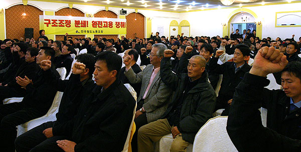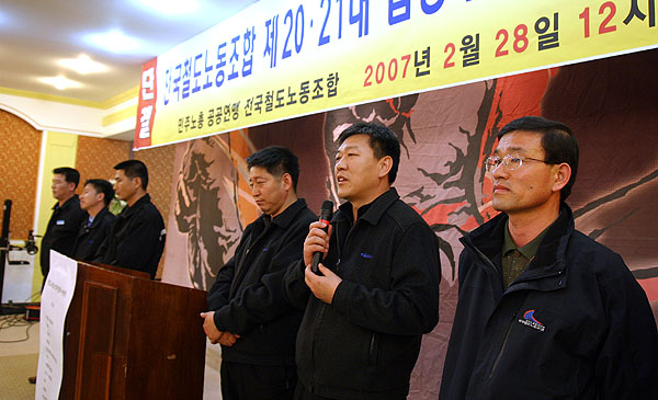 Àü±¹Ã¶µµ³ëµ¿Á¶ÇÕ Á¦ 20¡¤21´ë ÁýÇàºÎ ÀÌÃëÀÓ½ÄÀÌ 28ÀÏ 12½Ã¿¡ öµµ¿þµùȦ 2Ãþ¿¡¼ Àü±¹ °¢Áö¿¡¼ ¸ðÀÎ Á¶ÇÕ °£ºÎ¿Í ³ëµ¿°è ³»¡¤¿ÜºóµéÀÌ ´ë°Å Âü¼®ÇÏ¿© ¼ºÈ²¸®¿¡ ¿·È´Ù.
