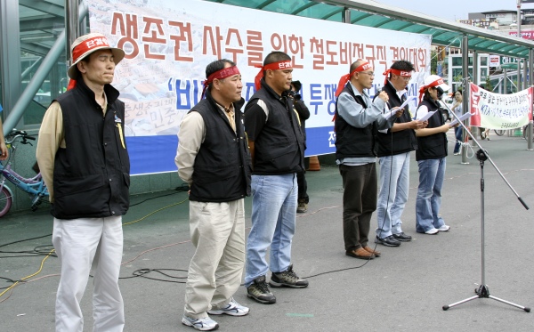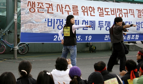 Àü±¹Ã¶µµ³ëµ¿Á¶ÇÕ ºñÁ¤±ÔÁ÷öÆó ÅõÀï½Çõ´Ü(ÀÌÇÏ ½Çõ´Ü)ÀÌ 19ÀÏ ¿ÀÈÄ 2½Ã¿¡ ´ëÀü¿ª ±¤Àå¿¡¼ Á¶ÇÕ¿ø 400¿©¸íÀÌ ¸ðÀÎ °¡¿îµ¥ ¹ß´ë½ÄÀ» ¿°í º»°ÝÀûÀΠȰµ¿¿¡ µé¾î°¬´Ù.