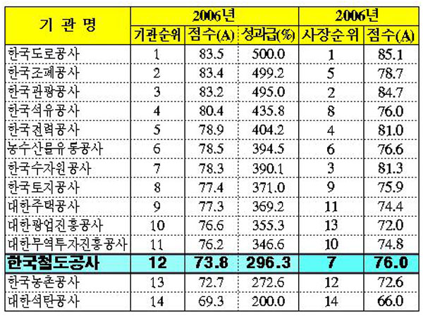 1À§ÀÇ Çѱ¹µµ·Î°ø»ç¸¦ Æ÷ÇÔÇÏ¿© öµµ°ø»ç´Â Áö³ÇØ 14À§ ²ÃÂî¿¡¼ 2´Ü°è ¿Ã¶ó°£ 12À§·Î Æò°¡ ¹Þ¾Ò´Ù. ¶ÇÇÑ Á¤ºÎÅõÀÚ±â°ü »çÀå°æ¿µ°è¾à ÀÌÇà½ÇÀû¿¡ µû¶ó Çѱ¹µµ·Î°ø»ç »çÀåÀÌ 1À§¿¡ ¿Ã¶ó ±â°ü°ú »çÀå ¾çÂÊ ¸ðµÎ 1À§¸¦ ÇÏ¿´°í ÀÌö »çÀåÀº 7À§·Î öµµ°ø»ç 12À§¿Í´Â ´ëÁ¶ÀûÀÎ °á°ú°¡ ³ª¿Ô´Ù.