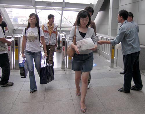 °è´ÜÀ» ¿Ã¶ó¿À´Â ½Ã¹Îµé¿¡°Ô ¼±Àü¹°À» ³ª´©¾îÁÖ°í ÀÖ´Ù. |