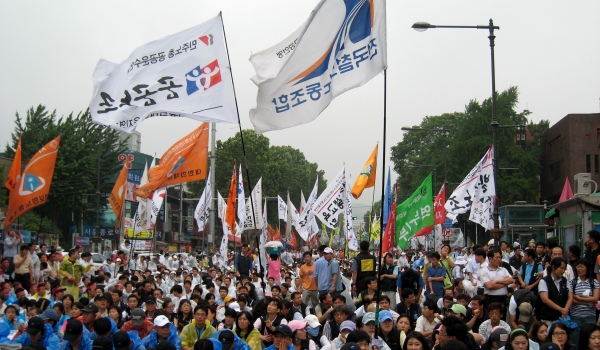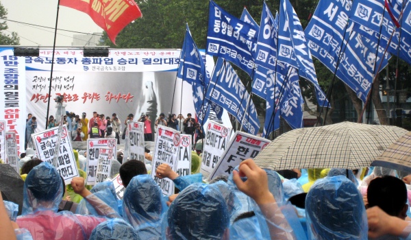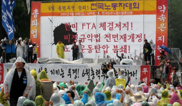 À̳¯ ¡®Àü±¹³ëµ¿ÀÚ´ëȸ¡¯ Âü¿©ÀÚµéÀº °áÀǹ®À» ÅëÇØ ¡ãÇѹÌFTA Áï°¢ Áß´Ü, ºñÁ¤±Ô¾Ç¹ý ¹«È¿È¿Í Àü¸é Àç°³Á¤, Ư¼ö°í¿ë³ëµ¿ÀÚ ¹× °ø¹«¿ø ±³¼ö ±³»ç ³ëµ¿±âº»±Ç º¸Àå, ±¹¹Î¿¬±Ý¹ý ¹× ÀÇ·á¹ý °³¾Ç ÀúÁö µî ´ç¸éÇÑ ¿ä±¸»çÇ×µéÀ» ÀïÃëÇϱâ À§ÇØ ³¡±îÁö ÅõÀïÇÒ °Í ¡ã¹ÎÁÖ³ëÃÑÀÇ ÇÕ¹ýÀûÀ̰í Á¤´çÇÑ ÅõÀïÀ» ¸ÅµµÇÏ°í ³ëµ¿Åº¾ÐÀÇ ±âȸ·Î ¸¸µé·Á´Â ±âµµ¿¡ °·ÂÈ÷ ´ëÀÀÇϰí, ³ëµ¿Åº¾ÐÀ» Áß´ÜÇÏÁö ¾ÊÀ» ½Ã¿¡´Â ¹ÎÁÖ³ëÃÑ Â÷¿øÀÇ ´õ¿í °·ÂÇÑ ÅõÀï¿¡ µ¹ÀÔÇÒ °Í ¡ã³ë¹«Çö Á¤±ÇÀÇ ³ëµ¿Åº¾ÐÀ» ºÐ¼âÇÏ°í ³ëµ¿ÀÚ ¹ÎÁßÀÇ »ýÁ¸±ÇÀ» °É°í 2007³â ´ëÅë·É ¼±°Å¸¦ °üÅëÇÏ´Â ´ëÁßÅõÀïÀ» Àü°³ÇÒ °Í µîÀ» °áÀÇÇß´Ù.