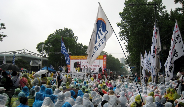 ±Ý¼Ó³ëÁ¶´Â ¡®FTA¡¯¶ó ¾²¿©Áø °Å´ëÇÑ ±ÛÀÚ¿¡ ºÒÀ» ºÙÀÌ´Â »ó¡ÀǽÄÀ» ³¡À¸·Î °áÀÇ´ëȸ¸¦ ¸¶ÃÆ´Ù. ±Ý¼Ó³ëÁ¶´Â À̳¯ 6½Ã°£ ÆÄ¾÷¿¡ Àü±¹¿¡¼ 10¸¸¿© µ¿ÁöµéÀÌ µ¿ÂüÇϰí ÀÖ´Ù°í ¹àÇû´Ù.