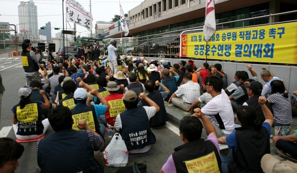 Áö»ç¾Õ¿¡¼ °ø°ø¿î¼ö¿¬¸Í ÁÖÃÖ·Î ¿¸° 'KTX¡¤»õ¸¶À»È£½Â¹«¿ø Á÷Á¢°í¿ëÃ˱¸' ¾à½Ä Áýȸ |