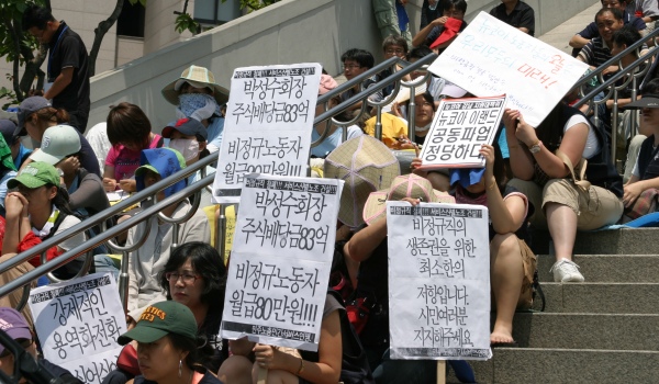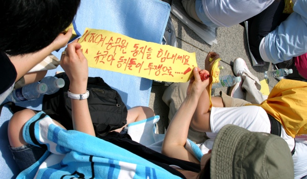 "³ëµ¿ÀÚ´Â Çϳª´Ù!" ÀÌ·£µåÀÇ ºñÁ¤±ÔÁ÷ ź¾Ð¿¡ ¸Â¼ 10¿© Àϰ ÅõÀï ÁßÀÎ ÀÌ·£µå³ëÁ¶ µ¿ÁöµéÀÌ ¿¬´ëÇß´Ù. |