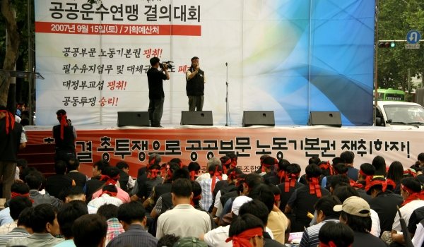 °ø°ø¿î¼ö¿¬¸Í(ÀÌÇÏ ¿¬¸Í) »êÇÏ ÁöÇÏö¡¤Ç×°ø¡¤¹ßÀü¡¤º´¿ø¡¤°¡½º µî Çʼö°øÀÍ»ç¾÷ÀåÀÇ Á¶ÇÕ¿øÀÌ ´ë°Å Âü¼®Çß´Ù. ¿¬¸ÍÀº Á¤ºÎÀÇ ¡®ÇʼöÀ¯Áö¾÷¹«Á¦µµ¡¯¿Í ¡®´ëü±Ù·ÎÁ¦µµ¡¯ µµÀÔÀ» °ø°ø¿î¼öºÎ¹® ³ëµ¿ÀÚÀÇ ³ëµ¿3±ÇÀ» ¹¬»ìÇÏ´Â ¾Ç¹ýÀ̶ó ÁÖÀåÇÏ¸ç ±ÔźÇß´Ù. ¿¬¸ÍÀº Á¤ºÎ¿¡ ´ëÇØ °³¾ÇµÈ ³ëµ¿¹ý¿¡ µû¸¥ ¡®½ÃÇà·É Æó±â¡¯¿Í ¡®³ëµ¿¹ý Àü¸é °³Á¤¡¯À» ¿ä±¸Çϰí ÀÖ´Ù.