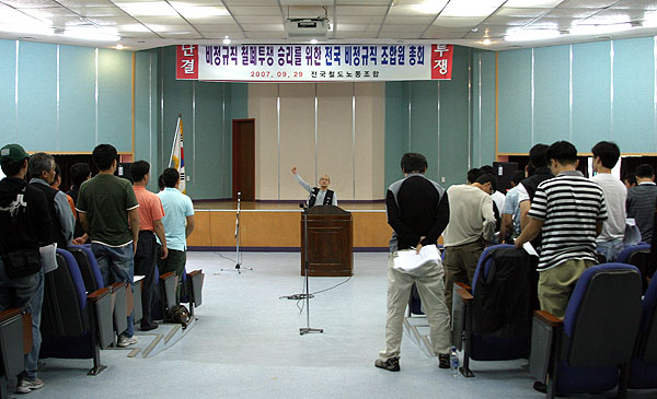 ¡®ºñÁ¤±ÔÁ÷ öÆóÅõÀï ½Â¸®¸¦ À§ÇÑ Àü±¹ ºñÁ¤±ÔÁ÷ Á¶ÇÕ¿ø ÃÑȸ¡¯¸¦ ¾Ë¸®´Â ÈûÂù °³È¸½Ä ¼±¾ð°ú ¡®Ã¶µµ³ëµ¿ÀÚ ´Ü°á ÅõÀï! ºñÁ¤±ÔÁ÷ ÅõÀï ½Â¸®ÇÏÀÚ!¡¯´Â ±¸È£°¡ ¿ï·Á ÆÛÁö¸ç ÃÑȸ°¡ ½ÃÀ۵Ǿú´Ù.