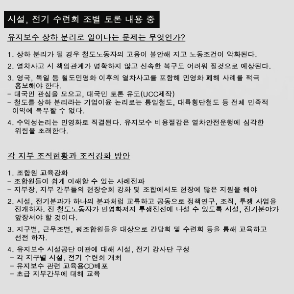 ȲÁ¤¿ì À§¿øÀåÀº ¡°°Ç±³ºÎ´Â ÀμöÀ§º¸°í¼¿¡ ¡®Ã¶µµÀ¯Áöº¸¼ö ¾÷¹«¸¦ öµµ°ø»ç°¡ ´ã´çÇϰí ÀÖ¾î Á¦3ÀÚÀÇ ÁøÀÔÀÌ ºÒ°¡´ÉÇÏ´Ù¡¯°í ¸í½ÃÇϰí ÀÖ½À´Ï´Ù. Á¦3ÀÚÀÇ ÁøÀÔÀ̶õ ½Ã¼³À¯Áöº¸¼ö¾÷¹«ÀÇ ½Ã¼³°ø´Ü À̰üÀÌ ¾Æ´Ï¶ó ¿ÜÁÖȸ¦ ÀǹÌÇÕ´Ï´Ù. ½Ã¼³À¯Áöº¸¼ö ¾÷¹«°¡ ¿ÜÁÖȵǸé, °¡Á¿ª »ç°í¿Í ¿µ±¹Ã¶µµ »ç°í¿¡¼µµ µå·¯³µµíÀÌ »çȸ¿¡ Å« Àç¾ÓÀ¸·Î µ¹¾Æ¿Ã °ÍÀÔ´Ï´Ù.¡±¶ó°í ¸»Çϸç ÀÌÈÄ ÁøÇàµÉ ¹Î¿µÈÀúÁö ÅõÀï¿¡ ½Ã¼³, Àü±â °£ºÎµéÀÌ Èû°ú ÁöÇý¸¦ ¸ð¾Æ ÁÙ °ÍÀ» ´çºÎ Çß´Ù.