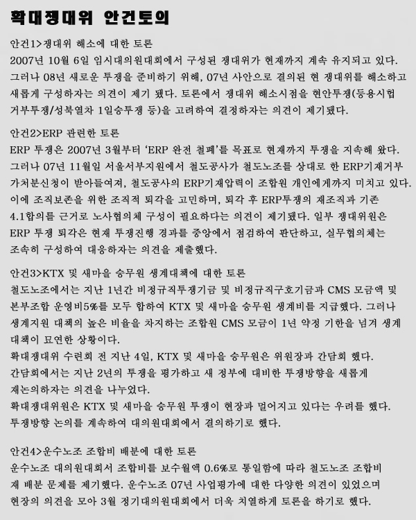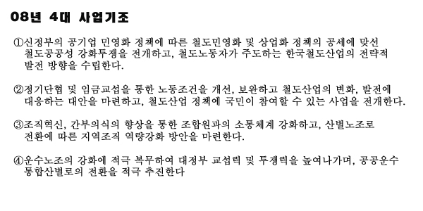 ÀÌ¿ë±â Á¤Ã¥±¹ÀåÀº À̸í¹Ú Á¤ºÎÀÇ Ã¶µµ ¹Î¿µÈ °ø¼¼¿¡ ´ëÀÀÇØ ³× °¡Áö »ç¾÷ ±âÁ¶¸¦ Á¦ÃâÇß´Ù. ¹ßÁ¦¸¦ µè°í È®´ëÀï´ëÀ§¿øµéÀº Áö¿ªº° 13°³ Á¶·Î ³ª´©¾î Åä·ÐÀ» ÁøÇàÇß´Ù.