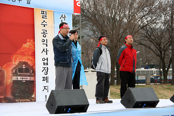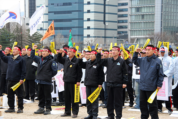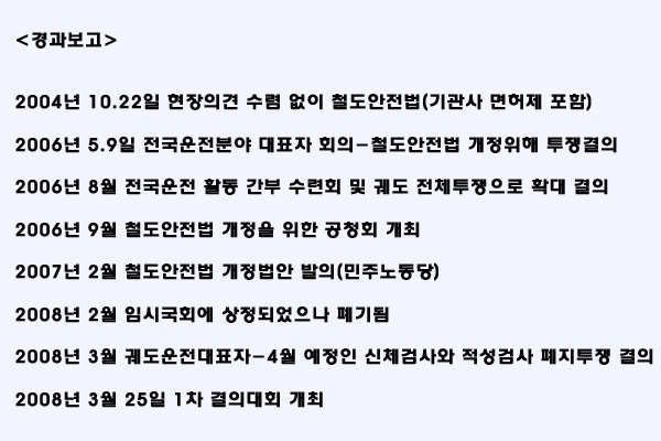 Ä£ ±â¾÷À» Ç¥¹æÇÑ À̸í¹Ú Á¤ºÎÀÇ ¹Î¿µÈ °ø¼¼¿¡ ¸Â¼ Àü±¹ ±Ëµµ³ëµ¿ÀÚµéÀÇ ÅõÀïÀÌ ½ÃÀ۵ƴÙ. 3¿ù 25ÀÏ ¿îÀüºÐ¾ß¸¦ Æ÷ÇÔÇØ öµµ³ëÁ¶ ½Ã¼³, Àü±â, ¿î¼ö ³ëµ¿ÀÚ 1,000¿©¸íÀº °úõ Á¾ÇÕû»ç ¿îµ¿Àå¿¡¼ ´ë±Ô¸ð Áýȸ¸¦ ¿°í, ¡®½Åü°Ë»ç °³Á¤¡¯°ú ¡®Æ¯º°Àû¼º°Ë»ç ÆóÁö¡¯¸¦ ¿ä±¸Çß´Ù. ÀÌ ³¯ Áýȸ¿¡¼ öµµ³ëÁ¶ ȲÁ¤¿ì À§¿øÀåÀº(±Ëµµ¿¬´ë »óÀÓ´ëÇ¥ °âÀÓ) 4¿ù 1ÀϺÎÅÍ ¡®Ã¶µµ¾ÈÀü¹ý ½ÃÇà·É¿¡ ÀÇÇÑ ½Åü°Ë»ç¸¦ °ÅºÎ¡¯ ÇÒ °Í¿¡ ´ëÇÑ ÅõÀï¸í·ÉÀ» ¼±¾ðÇß´Ù.