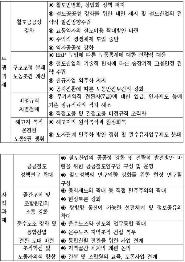1. ½ÅÁ¤ºÎÀÇ Ã¶µµ¹Î¿µÈ Á¤Ã¥¿¡ ¸Â¼ öµµ°ø°ø¼º °ÈÅõÀïÀ» Àü°³Çϰí, öµµ³ëµ¿ÀÚ°¡ ÁÖµµÇÏ´Â Çѱ¹Ã¶µµ»ê¾÷ÀÇ Àü·«Àû ¹ßÀü¹æÇâÀ» ¼ö¸³ÇÑ´Ù. 2. Á¤±â´ÜÇù ¹× Àӱݱ³¼·À» ÅëÇØ ³ëµ¿Á¶°ÇÀ» °³¼±¡¤º¸¿ÏÇϰí, öµµ»ê¾÷ÀÇ º¯È¡¤¹ßÀü¿¡ ´ëÀÀÇÏ´Â ´ë¾ÈÀ» ¸¶·ÃÇÑ´Ù. ±×¸®°í öµµ»ê¾÷ Á¤Ã¥¿¡ ±¹¹ÎÀÌ Âü¿©ÇÒ ¼ö ÀÖ´Â »ç¾÷À» Àü°³ÇÑ´Ù. 3. Á¶Á÷Çõ½Å ¹× °£ºÎÀÇ½Ä Çâ»óÀ» ÅëÇØ Á¶ÇÕ¿ø°úÀÇ ¼ÒÅëü°è¸¦ °ÈÇϰí, »êº°³ëÁ¶ Àüȯ¿¡ µû¸¥ Áö¿ªÁ¶Á÷ ¿ª·®°È ¹æ¾ÈÀ» ¸¶·ÃÇÑ´Ù. 4. ¿î¼ö³ëÁ¶ °È¿¡ Àû±Ø º¹¹«ÇÏ¿© ´ëÁ¤ºÎ ±³¼··Â ¹× ÅõÀï·ÂÀ» ³ô¿© ³ª°£´Ù. °ø°ø¿î¼ö ÅëÇջ꺰·Î ÀüȯÀ» Àû±Ø ÃßÁøÇÑ´Ù. |