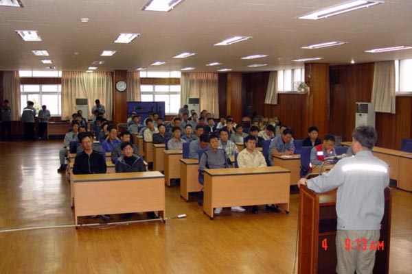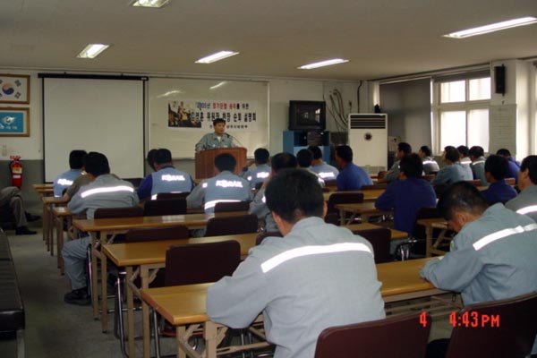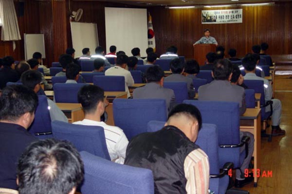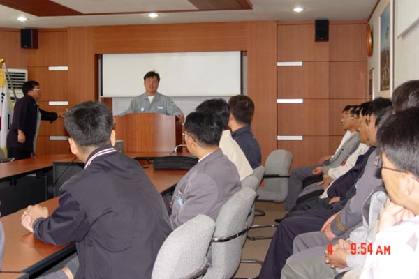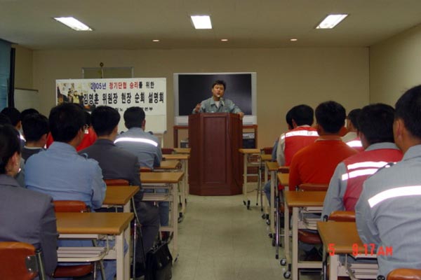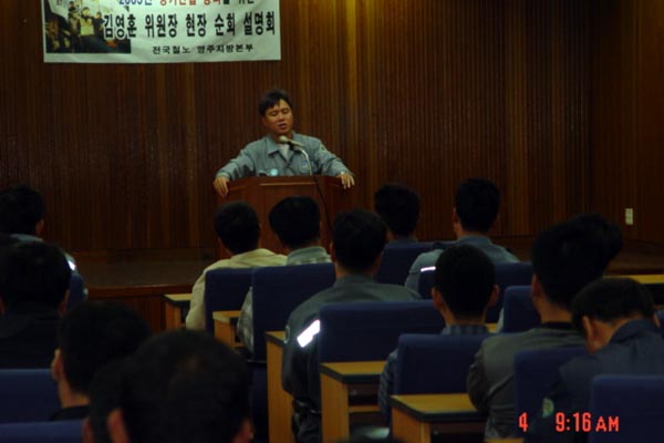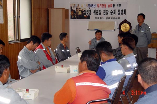 ±è¿µÈÆ À§¿øÀåÀÌ ¿µÁÖ¿ª ±³¾ç½Ç¿¡¼ ¿î¼ö, Àü±â, °ÇÃà, ½Ã¼³Á¶ÇÕ¿øµé¿¡°Ô ´ÜÇùÅõÀï¿¡ ´ëÇØ ¼³¸íÀ» Çϰí ÀÖ´Ù. |