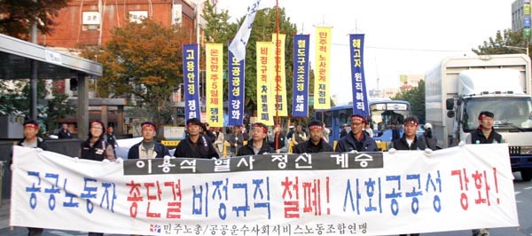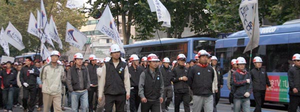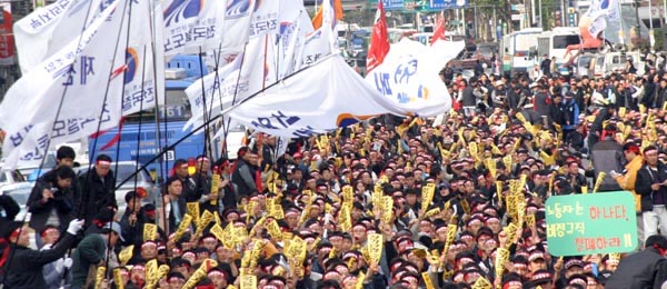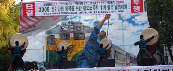 2005³â Á¤±â´ÜÇù½Â¸®¸¦ À§ÇÑ Ã¶µµ³ëµ¿ÀÚ Ãѷ°áÀÇ´ëȸ°¡ ¿Àõ¿© öµµ³ëµ¿ÀÚµéÀÌ ´ëÇзθ¦ »©°îÈ÷ ¸Å¿î °¡¿îµ¥ öµµ³ëµ¿ÀÚÀÇ ¹°°áÀÌ, öµµ³ëµ¿ÀÚÀÇ ±ê¹ßÀÌ, öµµ³ëµ¿ÀÚÀÇ ÇÔ¼ºÀÌ Ã¶µµ³ëµ¿ÀÚÀÇ ¿±¤À¸·Î ÆÄµµ¿Í °°À» ¹°°áÀÌ ¸ô¾ÆÄ¡´Â ´ë Àå°üÀ» ¿¬ÃâÇÏ¿´´Ù.
