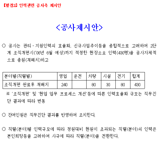 830¸í °ü·ÃÇÏ¿© 3´Ü°è Á÷¹«Áø´Ü(º»»ç,Áö¿ªº»ºÎ,Çö¾÷)ÀÌ ÁøÇàÁßÀ̸ç, ÇöÀç º»»ç±îÁö¸¸ Á÷¹«Áø´ÜÀÌ ÁøÇàµÇ¾úÀ½À» Âü°í ¹Ù¶ó¸ç, °ø»ç¾ÈÀ» ¼³¸íÅä·Ï ÇϰڴÙ. "°ø»ç´Â °ü¸®Áö¿øÀηÂÈ¿À²È, ½Å±Ô»ç¾÷ÀÇ ÃßÀÌ µîÀ» Á¾ÇÕÀûÀ¸·Î °í·ÁÇÏ¿© 2´Ü°è Á÷¹«Áø´Ü½Ã (³»³â »ó¹Ý±â, 6¿ù¿¹»ó) 430¸í, ÀÜ¿©ÀηÂÀº 3´Ü°è Á÷¹«Áø´ÜÈÄ °ø»ç ÀÚüÀûÀ¸·Î Ãæ¿øÇϰí, Á÷·Äº° Á¤¿ø´ëºñ Ãʰú Çö¿øÀº º»ÀÎ Èñ¸Á µîÀ» °í·ÁÇÏ¿© »ç±Ô¿¡ µû¶ó Á÷·ÄÀ» ÀüȯÇÑ´Ù."