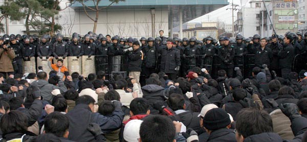 öµµ³ëµ¿ÀÚµéÀº ¸Á¿ì¿ª ´ö¼Ò¹æÇâ Ȩ¿¡¼ ³»·Á °æÂûÀÇ ¿øÃµºÀ¼â¸¦ ¶Õ°í û·®¸® ¹æÇâ ¿Â÷ ½Ã½Â½ÄÀ» ÇÏ´Â ¿¬´Ü±îÁö ÁøÃâÇÏ¿´´Ù. °æÂûÀÌ Çà»çÀåÀ» 2Áß 3ÁßÀ¸·Î ºÀ¼âÇÏ¿´Áö¸¸ ¿Â÷¾ÈÀüÀ» ¿Ü¸éÇϰí Ä¡·¯Áö´Â ¹«Ã¥ÀÓÇÑ °³Åë½ÄÀ» ÀúÁöÇϴ öµµ³ëµ¿ÀÚÀÇ ÅõÀïÀº ´Ù½Ã Çà»çÀå ¾Õ±îÁö ÁøÃâÇÏ¿´´Ù. ´Ù±ÞÇØÁø °æÂûµéÀÌ Ã¶µµ³ëµ¿ÀÚ¸¦ ¾ÕµÚ·Î µÑ·¯½Ñ ä Çà»ç°¡ ¼µÑ·¯ ¸·À» ³»·È´Ù.