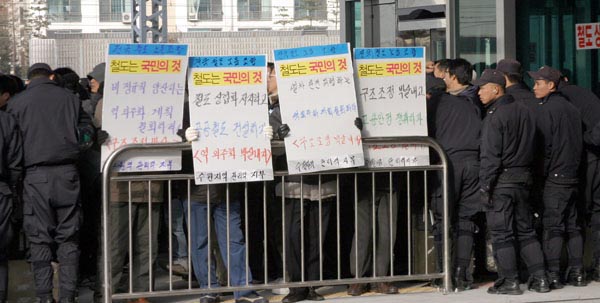 û·®¸®-´ö¼Ò Àüö±¸°£ °³Åë½ÄÀ» ÀúÁöÇϱâ À§ÇÏ¿© ¿ë»ê¹ß ´ö¼ÒÇà Àüµ¿Â÷¸¦ ž½ÂÇÑ 400¿©¸íÀÇ Ã¶µµ³ëµ¿ÀÚµéÀº ¸Á¿ì¿ª¿¡ ³»¸®ÀÚ¸¶ÀÚ È¨¿¡ µµ¿ÇØÀÖ´Â ¿ÏÀü¹«ÀåÂ÷¸²ÀÇ °æÂûµé¿¡ ÀÇÇÏ¿© ¿øÃµºÀ¼â µÈ ä öµµ³ëµ¿ÀÚµéÀº ÇÑ ¹ß¦µµ ³ª°¡Áö ¸øÇϵµ·Ï °æÂûµéÀÌ È¨¿¡¼ºÎÅÍ ¿¡¿ö½Î°í ÀÖ¾ú´Ù.
