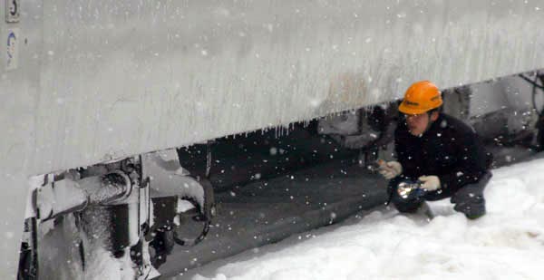 ¼ö¼Û¿øµéÀÌ ´«¸¸ ³ª¿Â º¡°ÅÁö ¸ðÀÚ¸¦ ¾²°í ¿Â÷¸¦ ÀÔȯÇϰí ÀÖ´Â ¸ð½ÀÀÌ ´«¿¡ µé¾î¿Â´Ù. ³²ÂÊ ¼±·Î¿¡¼´Â ¿Â÷¸¦ ÀÔȯ Çϱâ À§ÇÏ¿© Ç㸮±îÁö ºüÁö´Â ´«À» ÇìÄ¡°í Æ÷ÀÎÆ®¸¦ Á¡°ËÇϱâ À§ÇÏ¿© ³»¸®´Â ´«À» ¸ÂÀ¸¸é¼ °É¾î°¡´Â öµµ³ëµ¿ÀÚÀÇ ¸ð½ÀÀÌ Èñ »Ñ¿³°Ô º¸ÀδÙ.