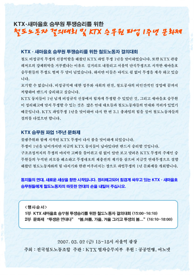 KTX¡¤»õ¸¶À»È£ ½Â¹«¿ø ÅõÀï½Â¸®¸¦ À§ÇÑ Ã¶µµ³ëµ¿ÀÚ °áÀÇ´ëȸ ¹× ¹®ÈÁ¦