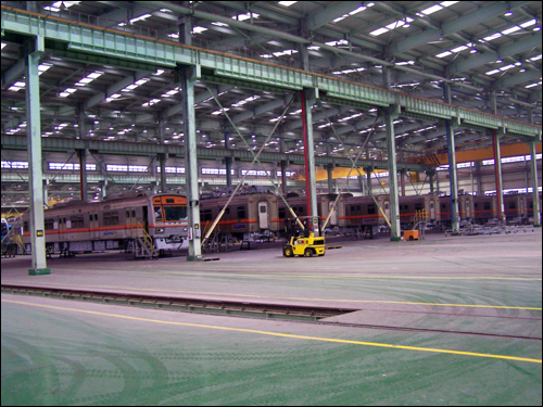 Àüµ¿Â÷ÀÇ °Ë¼ö´Â Áß¼ö¼±(Àüµ¿Â÷ ºÎǰÀ» Á¡°ËÇÏ´Â ¶óÀÎ)°ú °æ¼ö¼±(¹èÀü, ¹èÅ͸® µî ¿îÇàÂ÷·® Á¡°Ë ¶óÀÎ)À¸·Î ³ª´¶´Ù. ¿îµ¿Àåó·³ ³ÐÀº Á¤ºñ¼Ò¿¡ 20·®ÀÇ Àüµ¿¿­Â÷°¡ °Ë¼ö¸¦ ¹Þ±âÀ§ÇØ µÎ ÁÙ·Î ¼­ ÀÖ´Ù. ¿©±âÀú±â ½×ÀÎ Àüµ¿¿­Â÷ ºÎǰµéÀÌ ´«¿¡ µé¾î¿À°í ±â¸§ ³¿»õ°¡ ÄÚ³¡À» °¨µ·´Ù.