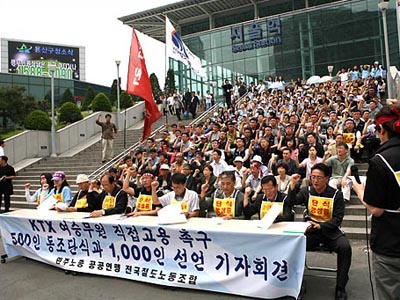 KTX ¿©½Â¹«¿øÀÇ ÃÑÆÄ¾÷ ÅõÀïÀÌ 100ÀÏÀ» ¸Â¾ÒÁö¸¸, ¾ÆÁ÷µµ ÇØ°áÀ» ½Ç¸¶¸®¸¦ ãÁö ¸øÇϰí ÀÖ´Â °¡¿îµ¥ 7ÀÏ ¿ÀÀü11½Ã ¼¿ï¿ª¿¡¼ °¢°è°¢Ãþ 1549¸íÀÇ ´ëÇ¥°¡ KTX¿©½Â¹«¿ø Á÷Á¢°í¿ëÀ» Ã˱¸ÇÏ´Â ¼±¾ðÀ» ¹ßÇ¥Çϰí, ÀÌ °¡¿îµ¥ 500¸íÀÇ ´ëÇ¥ÀÚ°¡ µ¿Á¶³ó¼º¿¡ µé¾î°¬´Ù.