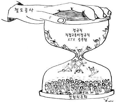 ¶ÇÇÑ 70³â´ëºÎÅÍ ÀϹÝöµµ¿Í Àüµ¿Â÷ ³»ºÎû¼Ò´Â Çâ¿ì»ê¾÷À¸·Î ÀÌ¹Ì ¿ÜÁÖÈ µÇ¾ú°í, ¼öµµ±ÇÀüö ÀϺΠ¿ª»ç ´ë¸Å¼Ò ¾÷¹«¸¦ À§Å¹Çϰųª Á¤ºñâ ³»ºÎ ¿ë¿ª µµÀÔ, Àüµ¿Â÷ Áß¼ö¼±, ±×¸®°í ±Ëµµ°Ç¼³ ¹× ±ËµµÁߺ¸¼ö´Â ÀÌ¹Ì ¿ÜÁÖÈ µÈ Áö ¿À·¡´Ù. ¶ÇÇÑ ÇöÀç Á÷Á¢°í¿ëÀ» ¿ä±¸Çϸç ÅõÀïÇϰí ÀÖ´Â KTX ½Â¹«¿øµéÀ» °í¼Óöµµ °³Åë½Ã Àη¿î¿ë È¿À²È¶ó´Â ¸í¸ñÀ¸·Î Çѱ¹Ã¶µµÀ¯Åë(ÁÖ)ÀÌ Ã¤¿ëÇÏ¿© ÆÄ°ßÇÏ¿´´Ù. À̿ܿ¡µµ 2004³â 4¿ù µé¾î¼´Â Á÷Á¢°í¿ëºñÁ¤±ÔÁ÷ÀÇ ¾÷¹«¿´´ø ±¸³»ÀÔȯ°ú ȯ°æ°ü¸®(û¼Ò) ¾÷¹«µµ ¿ÜÁÖÈ ÇÏ°í ½Å±Ô³ë¼± »ç¾÷¿¡ ´ëÇÑ ¿ÜÁÖȸ¦ Áö¼ÓÀûÀ¸·Î È®´ëÇϰí ÀÖ´Ù. ¿ÜÁÖȸ¦ ÅëÇØ öµµ°ø»ç´Â Åë°è»óÀ¸·Î´Â ºñÁ¤±ÔÁ÷ÀÇ ±Ô¸ð¸¦ ´ëÆø ÁÙÀÎ ¼º°ú¸¦ °ÅµÎ¾úÁö¸¸ ½ÇÁúÀûÀ¸·Î´Â ºñÁ¤±ÔÁ÷À» È®´ëÇϰí ÀÌÁß․»ïÁßÀÇ ÂøÃë¶ó´Â ´õ¿í ¿¾ÇÇÑ Á¶°ÇÀ¸·Î ³»¸ó ¼ÀÀÌ´Ù.