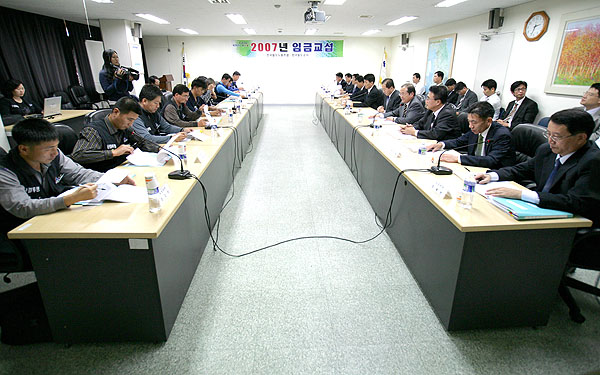 Á¤ºÎ´Â 2007³âµµ °ø±â¾÷ ÀÓ±ÝÀÎ»ó °¡À̵å¶óÀÎÀ¸·Î 2%¸¦ Á¦½ÃÇϸç, °ø»ç´Â Á¤ºÎ ¹æÄ§¿¡ µû¶ó ¾Þ¹«»õó·³ °°Àº ¸»À» µÇ³ú°í ÀÖ´Ù. ÇÏÁö¸¸ Á¤ºÎ´Â 2007³âµµ °ø¹«¿ø ÀÓ±ÝÀ» 2.5% ÀλóÇß´Ù. Çѱ¹ÀºÇà¿¡¼ ¹ßÇ¥ÇÑ ±Ý³âµµ ¿¹»ó ¹°°¡ Àλó·üÀº 2.6%¶ó°í ÇÑ´Ù. ¹ÎÁÖ³ëÃÑÀº 9% ÀÓ±ÝÀλóÀ» Á¦¾ÈÇϰí ÀÖ´Ù. ¾î´À ¸ð·Î »ìÆìº¸´õ¶óµµ Á¤ºÎ³ª °ø»ç°¡ ÁÖÀåÇÏ´Â 2% Àλó¾ÈÀº ¼³µæ·ÂÀÌ ¾ø´Ù. ´õºÒ¾î °ø»ç·Î ÀüȯµÇ¸é¼ ´ëºÎºÐÀÇ Á¶ÇÕ¿øµéÀÌ ¿¬±Ý ºÒÀÌÀÍÀ» ´çÇϰí ÀÖ´Ù. ³ëµ¿Á¶ÇÕÀº ¿¬±ÝºÒÀÌÀÍ ÇØ¼Ò¿¡ ´ëÇØ Ư´ÜÇù ¿ä±¸¾ÈÀ» Á¦ÃâÇßÀ¸³ª °ø»ç´Â ±³¼·ÇÒ ÀÇÁö¸¦ ÀüÇô º¸ÀÌÁö ¾Ê°í ÀÖ´Ù. Ÿ °ø»ç¿¡ ºñÇØ ÇöÀúÈ÷ ³·Àº ÀÓ±ÝÀ» º¸ÀüÇϱâ À§ÇØ ¾à¼ÓÇß´ø ´Ü°èÀû º¸Àüµµ ¡®³ë·ÂÇϰڴ١¯¸ç ±â¸¸À» º¸À̰í ÀÖ´Ù. ´Ü°èÀû º¸ÀüÀº °ø»çÀüȯ¿¡ ´ëÇÑ Ã¶µµ³ëµ¿ÀÚÀÇ ÀúÇ×À» ¹«¸¶ÇϰíÀÚ Çß´ø Á¤ºÎÀÇ ¾à¼ÓÀÌ´Ù.